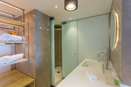 Despertarse mientras la luz del Mediterráneo va entrando lentamente en tu salón, salir a la terraza y poder darte un baño....toda una experiencia que podrás disfrutar en nuestras Suites de piscina. Terraza con acceso directo a la piscina para tu máxima comodidad y relax. Suite con vista frontal al mar